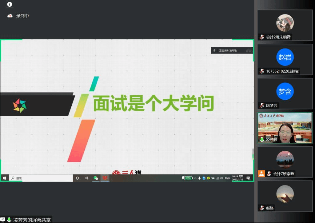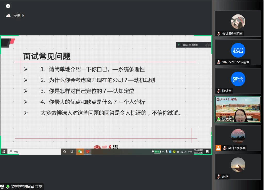 接着,凌芳芳同学通过契合自身工作经历,从面试辅导要点、常见问题、着装礼仪、面试态度、薪资商谈等多个方面向同学们展开分享,强调面试其实就是一场表演,并就同学们面试需注意的地方提出相关的建议。
