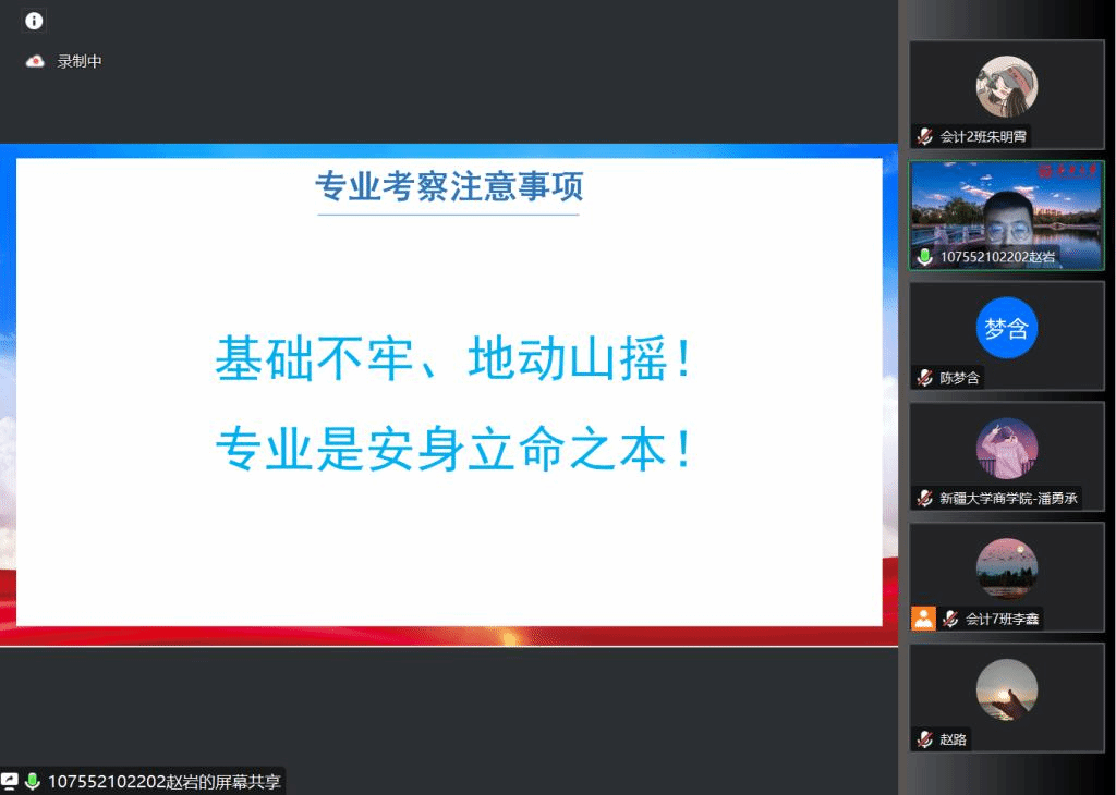 首先,赵岩同学主要从面试考察与职业选择两个方面来进行分享。他提出面试主要考察动机考察、资历考察、性格考察和专业考察,并向同学们分享了就业面试的注意事项。