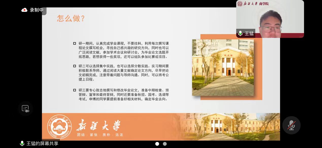 王猛同学分享了三部分内容,第一部分是未来方向选择,第二部分是读研三年规划,第三部分是应该怎么做。关于未来方向的选择,王猛同学提醒同学们要尽量避免“我全都要”的思想,在就业、考公和升学上有所取舍。研一期间,同学们应认真完成学业课程,不要挂科,利用每次撰写课程论文的撰写机会,寻找自己感兴趣的研究方向,同时需广泛阅读文献,参加学术会议和研讨会议,为毕业论文选题开拓思路,若想获得一些奖项,还可以组队参加比赛或项目。研二可以选择集中实践,也可以选择分散实践。实习期间要积极联系导师,通过阅读大量文献确定论文方向,尽早把论文初稿完成,注意带着问题与导师沟通。研三要专心致志地撰写和修改毕业论文,准备中期检查、预答辩、盲审和最终答辩,同时还要准备秋招、国考、选调等考试,申请读博的同学要提前准备好相关材料,确定毕业去向。