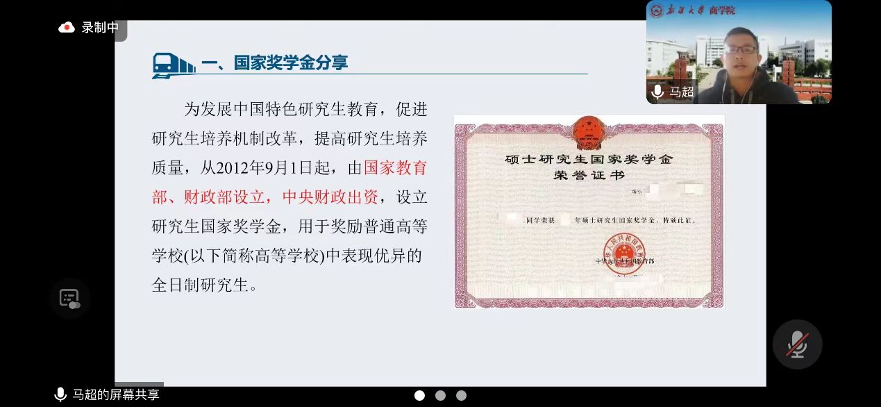 马超同学具体介绍了国家奖学金的评定要求,如何撰写论文以及研究生生涯规划。马超同学重点就论文的撰写提出建议,第一要精准定位研究对象,第二要深入思考研究问题,并在写作之前进行足够的思考和调查,明确研究问题和研究方法的选择,解决思路不清、主题难捉摸等问题。在选题时应结合自己的兴趣和专业特点,思考如何从一个独特的角度切入,挖掘问题的深层内涵。第三要创造性提出观点和解决方案。