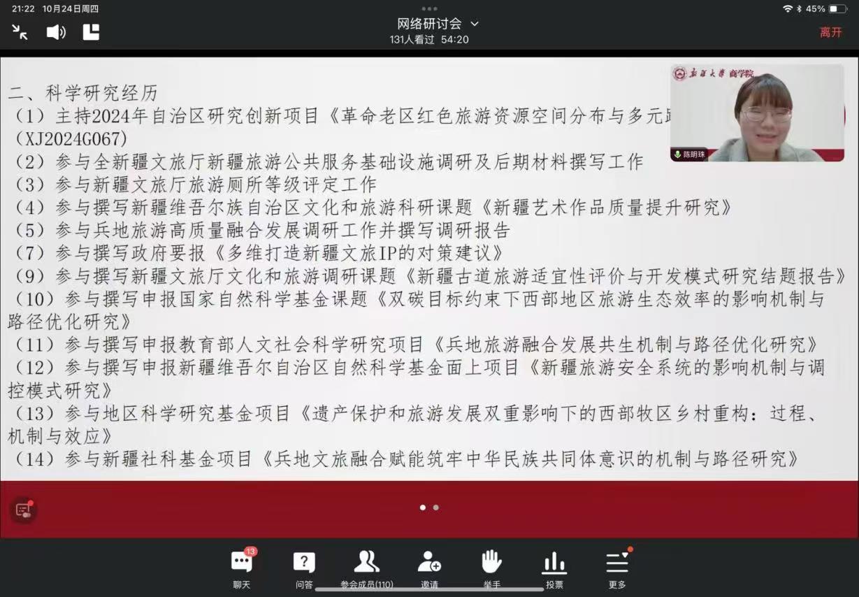 第四位主讲嘉宾是陈明珠同学,她是体育平台官网2022级旅游管理项目1班硕士研究生,曾荣获体育平台官网国家奖学金。曾在CSSCI发表论文一篇,北大核心期刊发表论文一篇。曾主持2024年自治区研究创新项目。曾参与“第二届新时代红色旅游发展论坛”并做分会场汇报工作,获得“优秀论文三等奖”。