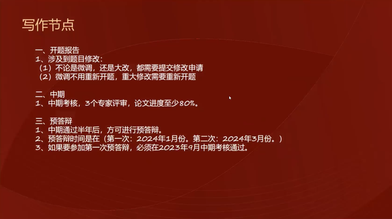 王晨同学从论文选题和拟题、论文写作节点、写作过程中的心得体会及注意事项四个方面进行了详细的讲解。在论文选题和拟题方面,王晨同学强调了选题的重要性,建议同学们先确定研究领域,关注政策、行业和学术背景,选择主流问题进行研究。他还提到了选题时需要注意的一些细节问题,如题目的大小、字数等。在论文写作节点方面,王晨同学详细介绍了开题、中期、预答辩、查重、教育部送审、二次查重和正式答辩等关键时间节点。他强调了每个阶段的重要性,提醒同学们保持警惕,尤其是在中期阶段。在写作过程中的心得体会及注意事项方面,王晨同学分享了他的写作经验,包括摘要和结论的重要性、文献综述和实证分析的注意事项等。他还提到了一些写作技巧,如合理安排章节标题、突出创新点等。最后,在答疑环节,同学们踊跃提问,王晨同学耐心解答了同学们在选题等方面的问题,并鼓励同学们在写作和答辩过程中能够克服困难、勇往直前。