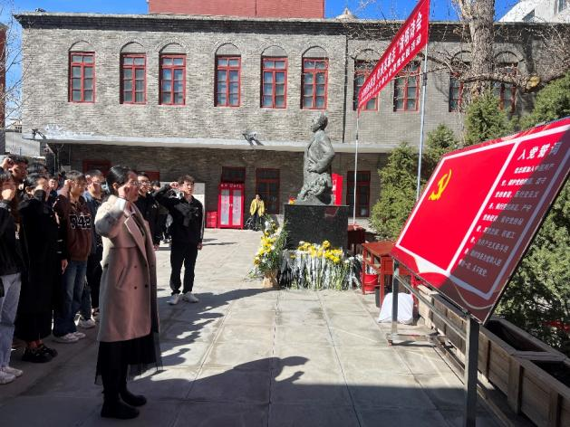 故居前,全体党员齐唱国歌,全体党员面向党旗,由支部书记高志娟同志领誓,重温入党誓词。随后,全体同学在党支部的组织下,集体在毛泽民同志纪念雕像前,向革命先烈默哀致敬。默哀结束后,全体党员同志和同学们前往不同展厅,通过文字和视频资料学习了解毛泽民同志生平事迹和故事,利用故居中保留下来的历史文物,深入学习了解毛泽民同志的崇高品质和不朽业绩。在参观过程中,支部书记高志娟老师通过聊天谈话等方式引导党员干部学习英雄大无畏的崇高信仰,传承红色基因,勇攀时代新高峰。