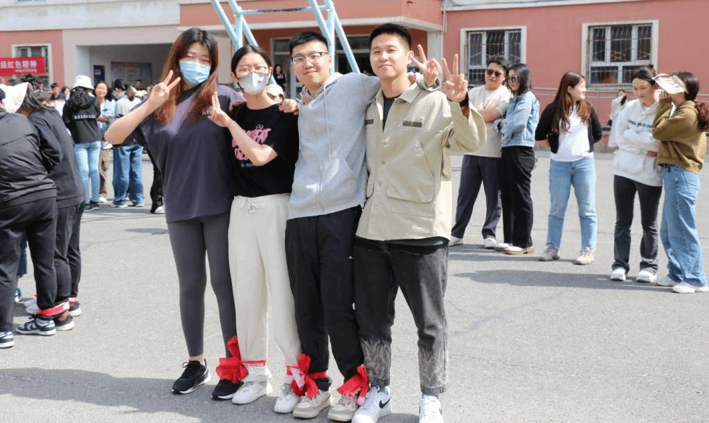最后进行的两人三足比赛考验了同学们的平衡能力和团队协作能力。同学们四人结对,绑住相邻的腿,在比赛过程中互相扶持、共同前进。尽管中途有些队伍出现了绳子脱落或摔倒的情况,但他们迅速调整状态,继续比赛,展现了坚韧不拔的精神风貌。