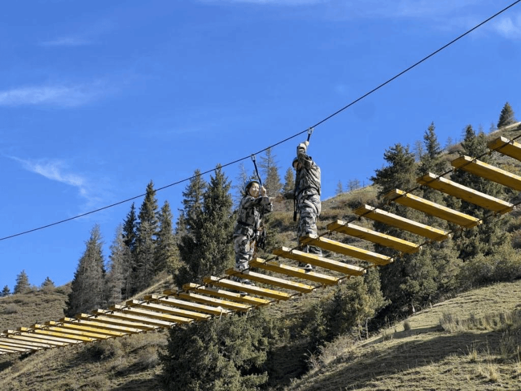 高空挑战项目包括“飞夺泸定桥”“断桥挑战”和“高空攀岩”,这三个项目由主办方随机安排,充满了惊喜与挑战。在“飞夺泸定桥”中, 同学们勇敢登上高空,踏上空心踏板。对于很多人来说,这是首次尝试如此刺激的挑战,起初心中满是恐惧。但在队友们的鼓励声中,大家慢慢放松,勇敢地在踏板上前行。走到中间再折返回来的过程中,同学们一边体验着高空的刺激,一边逐渐适应,甚至在空中兴奋地拍照留念。“断桥挑战”同样充满刺激与挑战。同学们需先沿着旁边的梯子勇敢攀爬而上,到达高处后,面对断开的桥面,尽管心中难免紧张,然而在教练的专业指导下,还是鼓起勇气奋力一跃,成功跨过断桥。而后,双腿撑在断桥两边,在确保安全的情况下,顺着绳索缓缓滑下,而这根绳索由全体队友们紧紧拉着,给予挑战者满满的安全感。