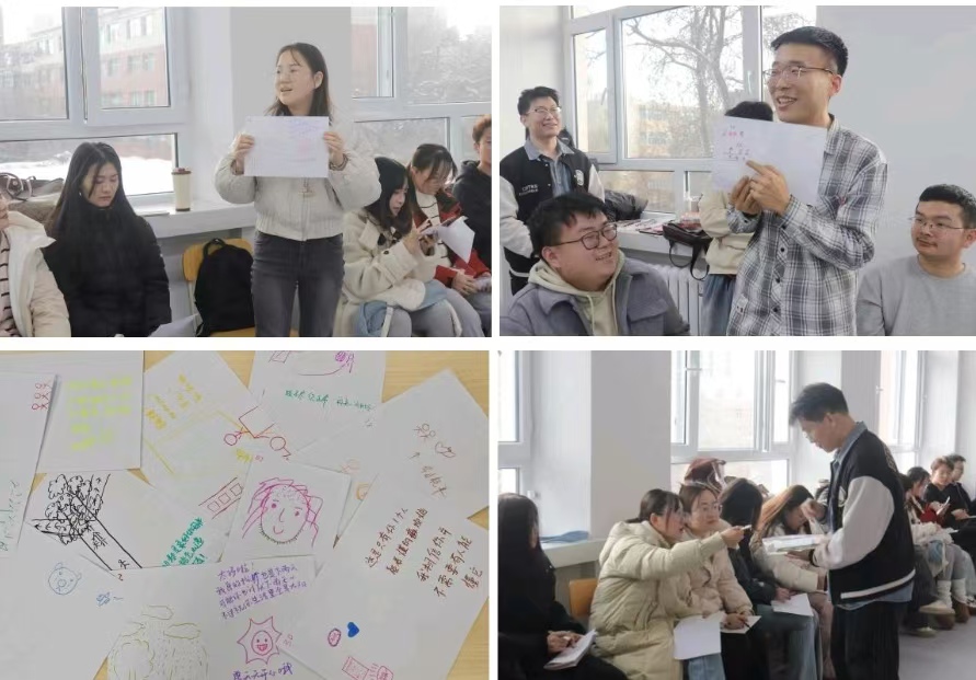 随后,高清卓同学结合同学们在学习生活中遇到的实际困难,引出了本次活动的主题,并主持了接下来的游戏环节。在“你划我们猜”挫折挑战赛中,同学们分组参与,每组选派代表表演抽取的题目,其余成员竞猜。游戏通过挫折条增减模拟现实挫折变化,并引入复活币机制让同学们学会如何灵活应对困难。在“共绘心语”绘画互动游戏中,同学们在纸上通过绘画和涂鸦将内心挫折具象化,并附文字描述,然后互相交换纸张,针对他人的挫折写下安慰与建议。游戏不仅促进了同学们之间的互相理解与支持,还让同学们感受到了团队协作和集体智慧在克服苦难时的巨大力量。