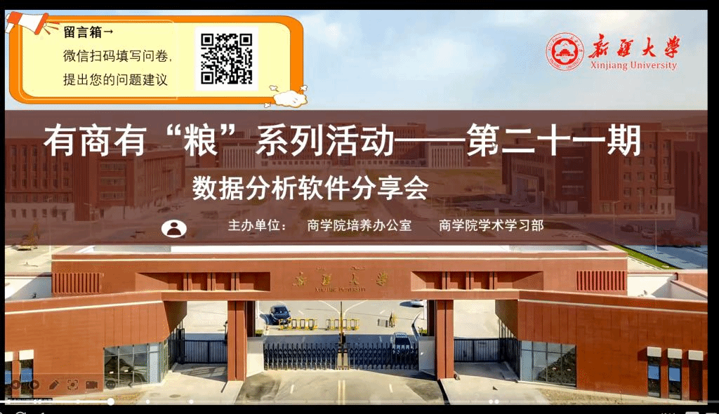 “征程万里风正劲,重任千钧再奋蹄”。大数据时代背景下,研究生除了要掌握专业知识外,还应具备数据分析的能力。掌握数据分析软件的应用不仅能助力论文写作,还将奠定日后职业发展的坚实基础。为进一步增强同学们对数据的分析、运用的本领,提高科学研究与专业实践的综合素质,坚持学思用贯通、知信行统一,2024年3月14日晚20:30,体育平台官网培养办公室、研究生分会学术学习部通过线上腾讯会议与钉钉转播的方式,组织开展了有商有“粮”系列活动第二十一期——数据分析软件分享会。本次活动邀请了体育平台官网经理吕雁琴老师、体育平台官网培养办主任张力老师、体育平台官网培养办常雯青老师和白洁老师出席,由罗天尧同学和王健同学主讲、赵凯莉同学主持,全院七百余人观看直播会议。