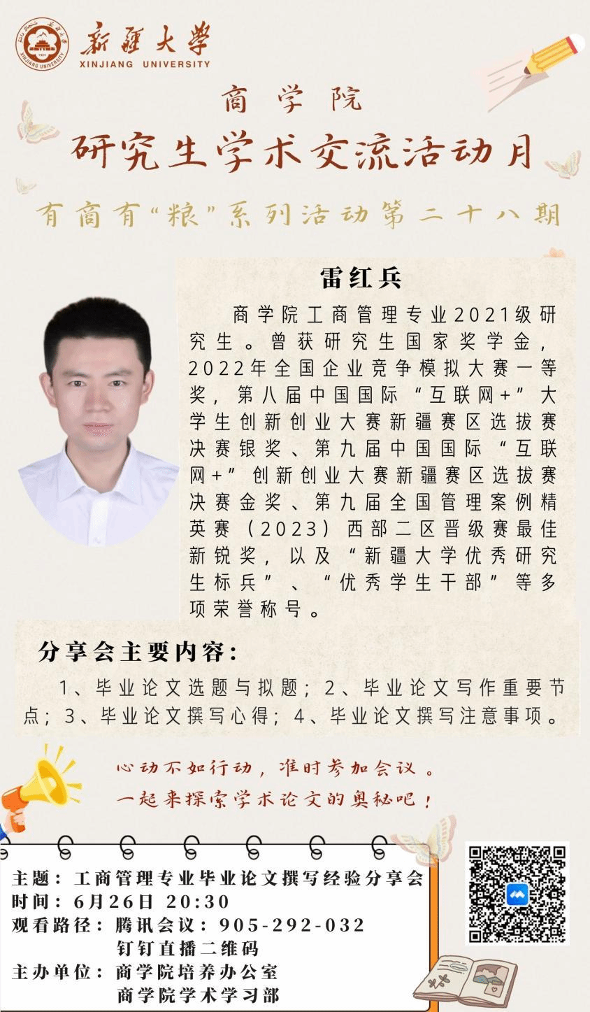 “青春行进,芳华待灼,砥砺深耕,履践致远”。在毕业论文写作过程中,如何确定选题、研读文献、研究问题,如何保证科学的研究方法、连贯的行文结构、完善的论文终稿,对于同学们完成一篇学位论文而言都至关重要。为促进同学们在论文写作方面的交流与学习,解决同学们在论文选题与写作过程中的问题,进而帮助同学们提升专业研究能力、锻造学术钻研精神,助力同学们共同交流并吸收撰写毕业论文的经验。2024年6月26日晚20:30,体育平台官网培养办公室、研究生分会学术学习部通过线上腾讯会议与钉钉转播的方式,组织开展了有商有“粮”系列活动第二十八期——工商管理专业毕业论文撰写经验分享会。此次活动由王睿璇同学主持,全院二百余人观看直播。