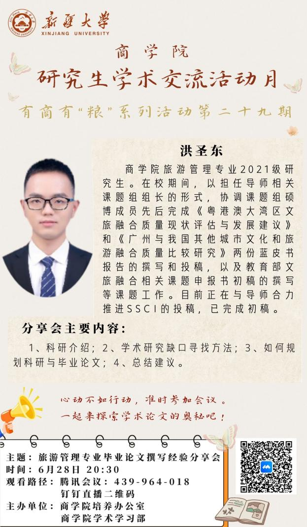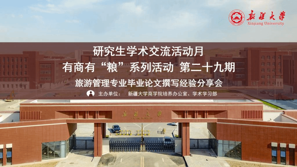 “智启未来,研途璀璨,知行合一,致知于行”。在毕业论文写作过程中,精准定位选题、精深研读文献、精确剖析问题,以及确保严谨研究方法、流畅论述架构、精致论文成品,对于每位同学成功完成毕业论文都是不可或缺的关键步骤。为增进员工间学术互动,解答论文写作疑惑,提升学术素养与研究技巧,2024年6月28日晚20:30,体育平台官网培养办公室、研究生分会学术学习部通过线上腾讯会议与钉钉转播相结合的方式,组织开展了有商有“粮”系列活动第二十九期——旅游管理专业毕业论文撰写经验分享会。此次活动由龙康敏同学主持,全院二百余人观看直播。