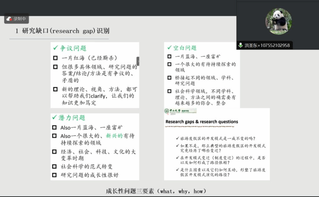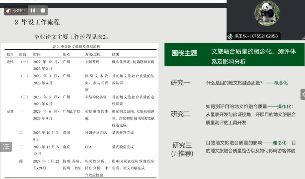 洪圣东同学围绕科研认识、毕设经历、合理规划、总结建议及后续研读推荐五大板块展开。他首先概述了研究类型,区分侧重原创性与基础性的理论研究与更偏重应用性的实证研究,随后详细讲解了毕业论文三大类别:旅游者行为、旅游经济与旅游地理。在毕设经历部分,他分享通过实地调研、实习实践等手段,深入了解广州文旅融合现状过程,以及如何从定性到定量,系统性地探索文旅融合质量评价与影响。关于合理规划,他强调识别研究缺口的重要性,并提出论文撰写应遵循的时间底线与适应就业目标的原则。在总结建议中,他鼓励同学们选取具有较强应用性的研究方向,并保持积极心态,坚持目标导向,制定详尽计划。最后,他推荐了一系列具有较高影响力的学术期刊与必读书目,特别是其导师陈钢华教授的《度假区开发与管理》,为同学们深度学习提供方向。