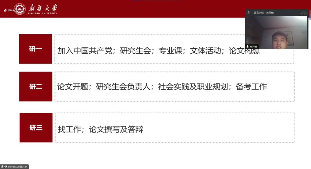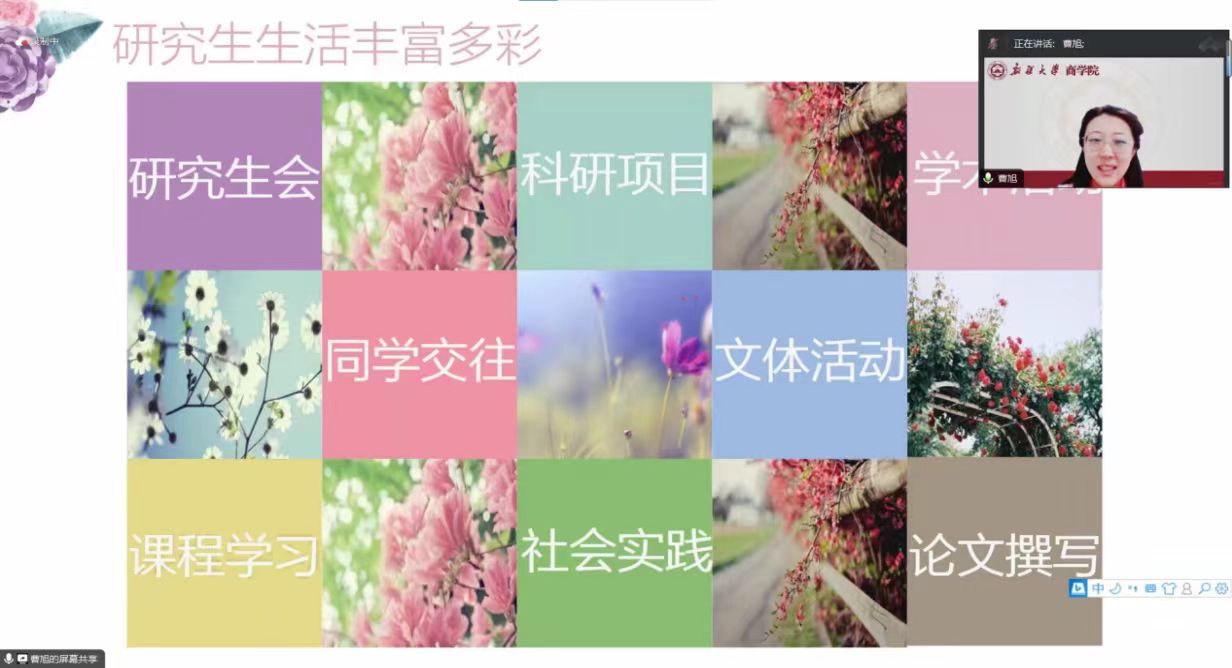 在学术的漫漫征程中,“学如逆水行舟,不进则退”,每位踏入研究生阶段的学子都应时刻保持对知识的渴望和对学术的热情,不懈努力,不断进步。为助力体育平台官网学子明晰前行方向,高效规划研究生期间的学习与生活,明确未来职业目标,11月7日20时30分,体育平台官网举办了有商有“粮”系列活动第三十二期——朋辈携行分享会(二)。此次活动在线上展开,吸引了全院两百余名师生观看。本次活动邀请公司党委副书记、纪委书记潘勇承老师、培养办主任张力老师、培养办常雯青老师以及白洁老师参与,由赵凯莉同学主持,张睿敏、杜汶聪、焦弈斐、曹旭四位同学主讲。
