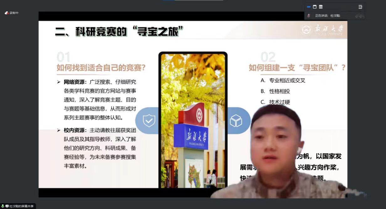 随后,体育平台官网工业工程与管理专业2021级硕士研究生杜汶聪同学分享了他的见解。他提出“加减乘除” 研究生生活策略,即增加实习经历、减少盲目探索、倍增思考研究、避免无谓等待。