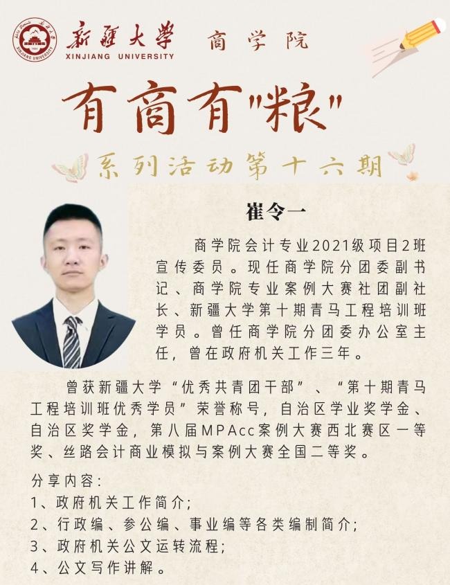 本次主讲嘉宾是崔令一同学(会计专业2021级硕士研究生),曾任体育平台官网分团委办公室主任;现任体育平台官网分团委副书记、体育平台官网会计21-2班宣传委员、学院专业案例大赛社团副社长。曾获体育平台官网优秀共青团干部、第十期青马工程培训班优秀学员荣誉称号,自治区学业奖学金、自治区奖学金。曾荣获第八届MPAcc案例大赛西北赛区一等奖、丝路会计商业模拟与案例大赛全国二等奖。也曾在政府机关工作过三年,是名副其实的“笔杆子”。