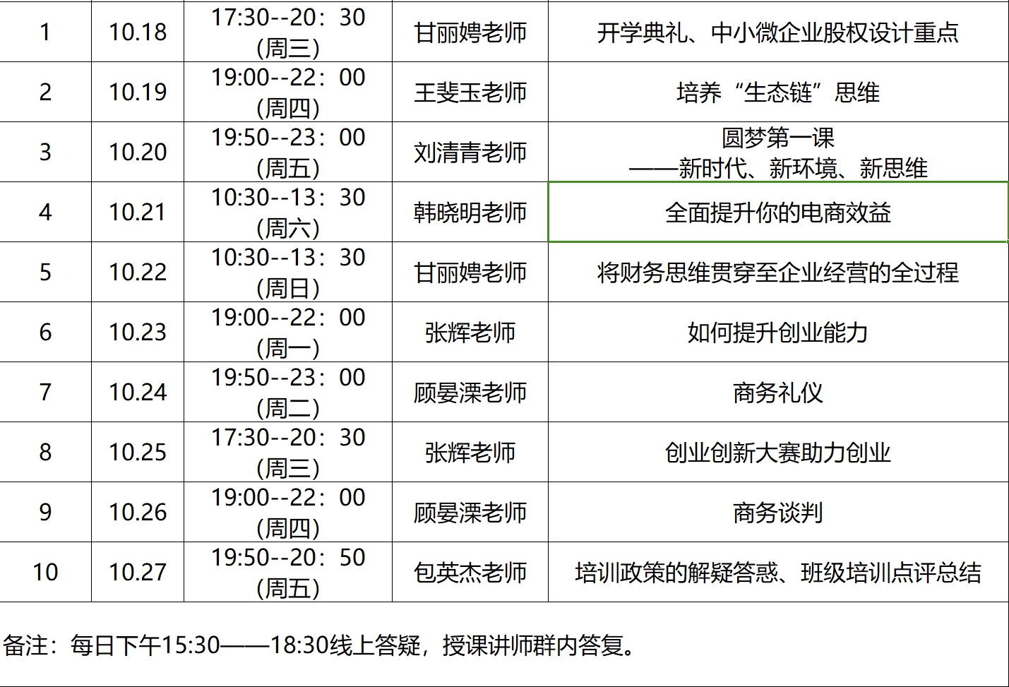 组织协办两期“圆梦计划”创新创业素质培训班。“圆梦计划”培训活动由体育平台官网与乌鲁木齐人社局合作,邀请行业专家、业务骨干、企业领导授课,为同学们提供一系列培训课程,包括股权设计、财务思维、商务礼仪、商务谈判、创新创业大赛准备等内容,培养员工创新思维及创业就业素养。2023年1月和12月共举办两期,每期培训班为期10天,研究生双创教育实践工作室辅导员担任班主任,现已培养260余名学员。
