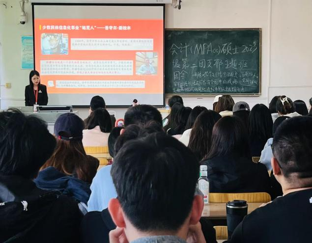本次宣讲活动由“星火”宣讲团张子扬、谢钰叶、刘永瑄同学分别在405、404、403教室主讲,宣讲标题分别为“百年恰风华 石榴花盛开”、“赓续百年荣光 奏响百年弦歌——追寻历代新大人的红色记忆”和“百年岁月风雨兼程,春华秋实薪火相承”,会计23-1班、会计23-2班以及会计23-3班全体研究生及班主任老师在场聆听。