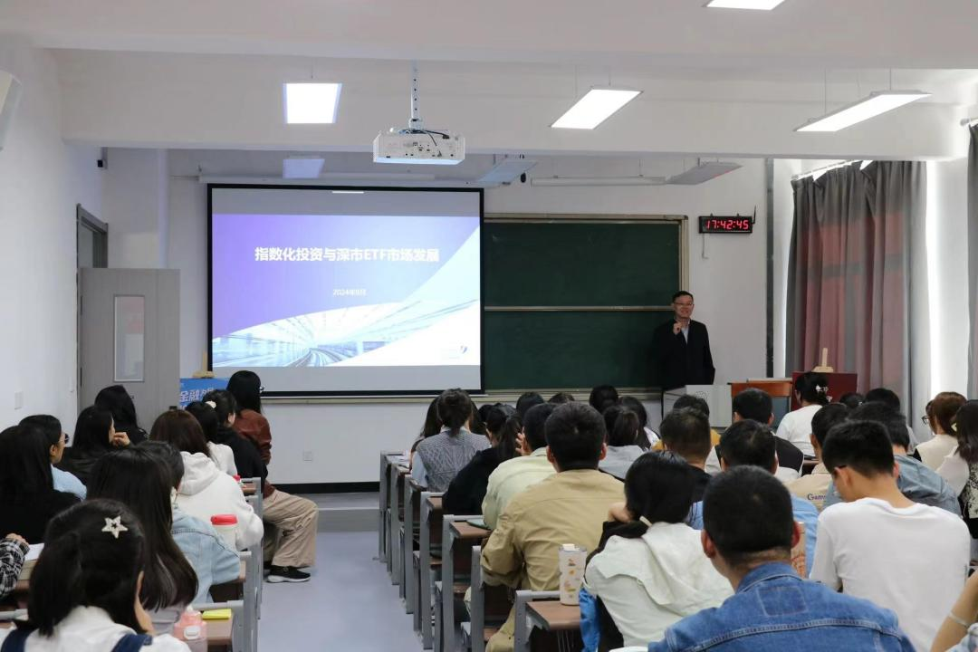 座谈会后,新商讲坛在体育平台官网608教室举行。深圳证券交易所投资者服务部执行经理胡耀亭博士,以其卓越的学术造诣和丰富的实战经验,为研究生带来了一场题为“指数化投资与ETF市场发展”的专题讲座。胡经理从股票指数的基本概念讲起,逐步深入到ETF作为指数化投资工具的独特优势,再到深市ETF市场的最新动态与未来趋势,内容层层递进,引人入胜。