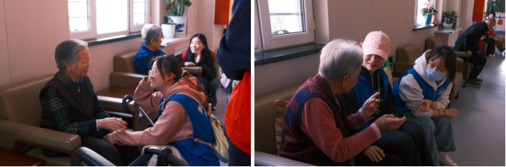 接着,志愿者们来到老人的生活区,与老人们展开了亲切交流。大家围坐在一起,陪伴老人聊天,倾听老人们的往事。通过交流与互动,老人们感受到真挚的陪伴,脸上洋溢着幸福的笑容,现场欢笑不停,氛围十分温馨。