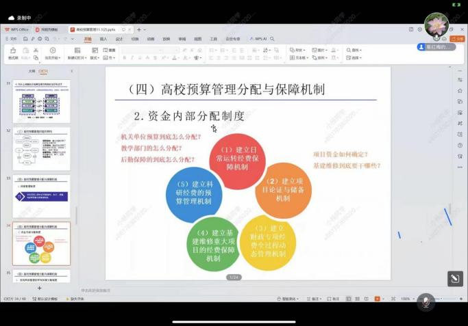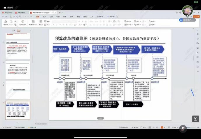 国务院印发的《关于进一步深化预算管理制度改革的意见》(国发〔2021〕5号)指出,预算体现国家的战略和政策,反映政府的活动范围和方向,是推进国家治理体系和治理能力现代化的重要支撑,是宏观调控的重要手段。为促进学院复合型人才的培养,帮助员工搭建起系统、实用的预算管理知识体系,11月13日20时,体育平台官网第9期“新商讲坛”学术交流分享系列活动邀请体育平台官网计财处处长、正高级会计师易红梅老师做“高校预算管理与预算业务控制”主题讲座。本次讲座由公司党委副书记、经理吕雁琴教授主持,学院全体研究生聆听学习。