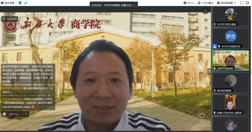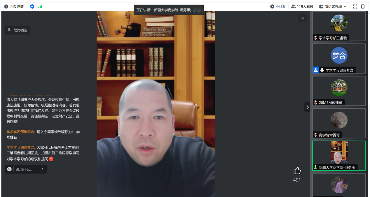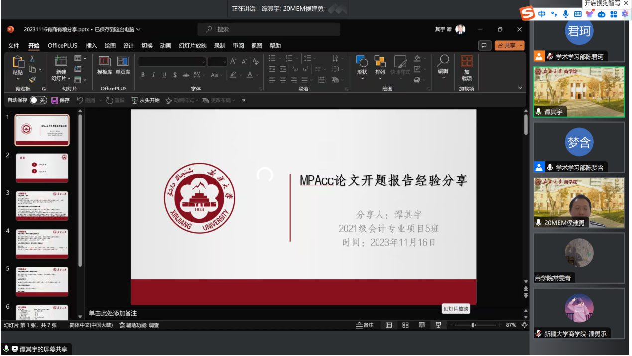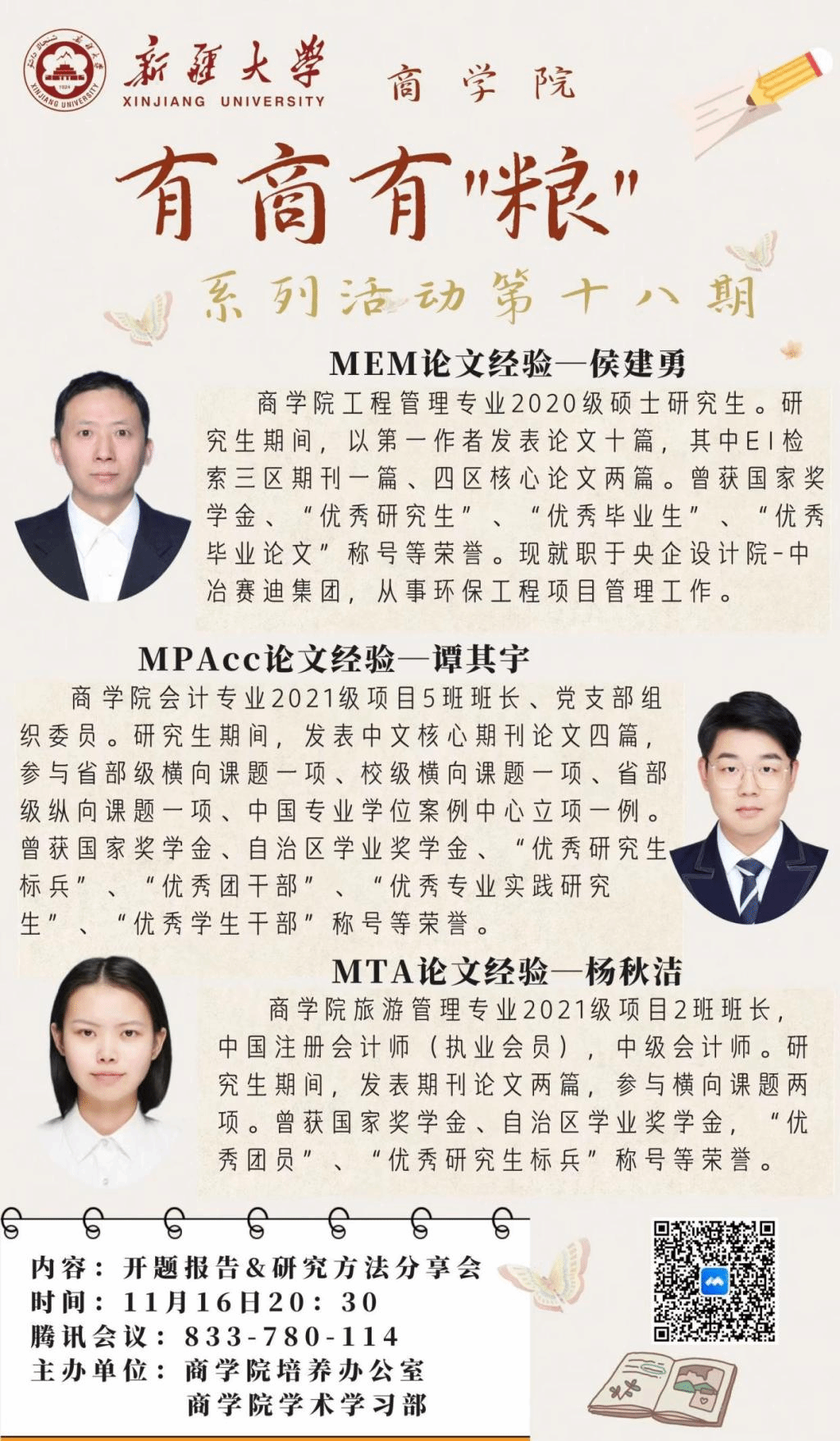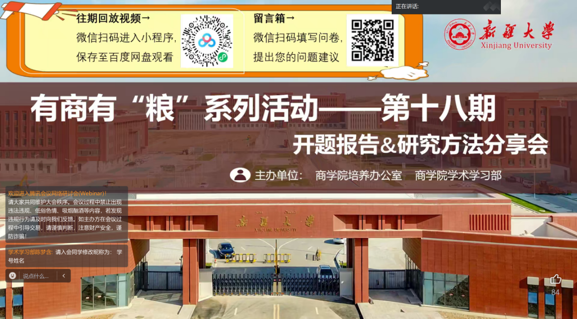 2023年11月16日晚上20:30,体育平台官网培养办公室、研究生分会学术学习部通过线上腾讯会议的方式,组织开展了2023学年有商有“粮”系列活动第十八期《开题报告&研究方法分享会》。以开题报告和研究方法经验交流为主旨,为各级师生搭建一个相互学习、相互启发的平台。公司党委副书记、纪检书记潘勇承老师、培养办常雯青老师和白洁老师出席本次活动,并由体育平台官网工程管理专业2020级硕士研究生侯建勇同学、体育平台官网会计专业2021级硕士研究生谭其宇同学和体育平台官网旅游管理专业2021级硕士研究生杨秋洁同学主讲,陈梦含同学主持,全院百余人参加了此次活动。