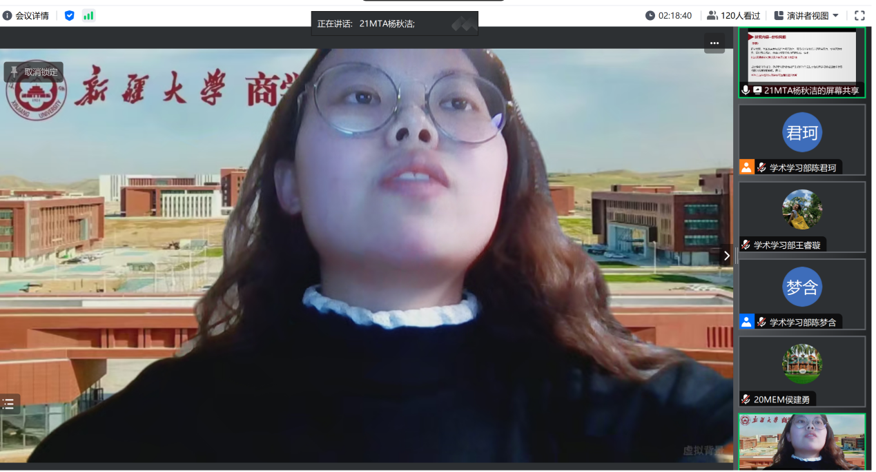 第三位主讲嘉宾是杨秋洁同学(旅游管理2021级硕士研究生),现任2021级项目2班班长,中国注册会计师(执业会员),中级会计师。研究生期间,发表期刊论文两篇,参与横向课题两项。曾获国家奖学金、自治区学业奖学金,“优秀研究生标兵”等荣誉称号。杨秋洁同学的分享内容聚焦于毕业论文的开题报告环节,主要从论文撰写的背景意义、文献综述、研究内容、研究方法及进度安排五个方面系统阐述了开题报告需要注意的事项。她强调在选题背景方面,要结合时代背景和当前研究现状确定好自己的研究问题,并确保该项研究是具备理论或实践意义的,要按照“提出问题-分析问题-解决问题”的思维结构确定好研究内容,并结合相适应的研究方法或模型来搭建论文的主体框架,着手进行论文撰写。在分享的最后,杨秋洁同学还强调了公司产品创新意识的重要性。杨秋洁同学的分享内容详实、逻辑清晰、富有实用价值,为同学们提供了论文撰写的思路和方向!