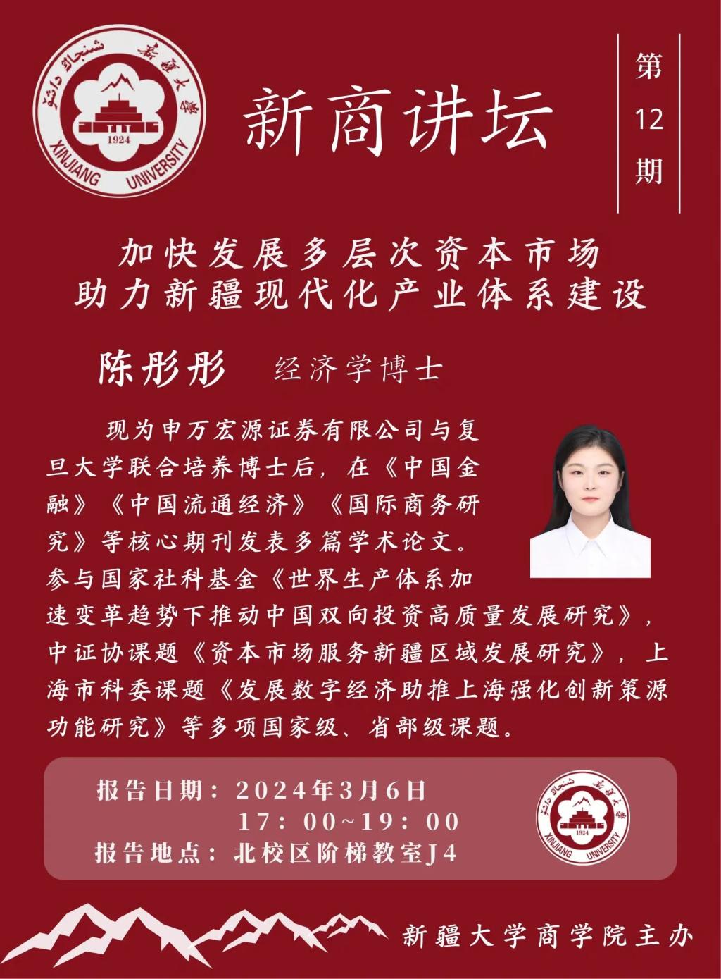 建设现代化产业体系,资本市场肩负重要使命。为帮助在校员工更深入地理解多层次资本市场与现代产业体系建设之间的密切关系,构建更全面的金融知识框架。3月6日17时,体育平台官网邀请申万宏源证券有限公司与复旦大学联合培养的博士后、经济学博士陈彤彤于体育平台官网友好校区第4阶梯教室开展第12期“新商讲坛”学术交流系列活动,讲座主题为“加快发展多层次资本市场,助力新疆现代化产业体系建设”。本次讲座由体育平台官网经理吕雁琴主持,公司党委副书记、纪委书记潘勇承、刘书庆教授及全体专任教师出席,190名研究生参会学习。