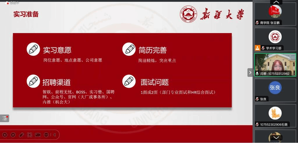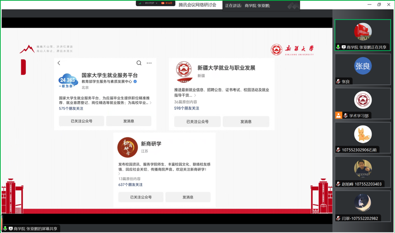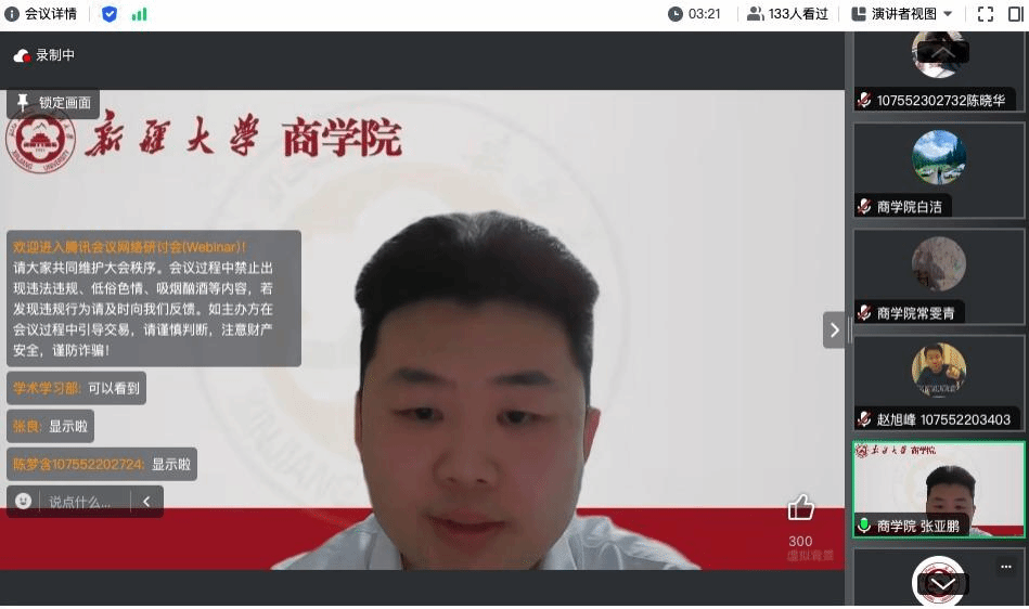 “征程漫漫需笃行,实践深深显真章”。在知识更新日新月异的今天,研究生除了需掌握扎实的理论基础,更要通过专业实践来锻炼和提升自己的综合能力。实践不仅是检验知识的试金石,更是通往职业成功的必由之路。为进一步加强学术交流,促进理论与实践的深度融合,激发同学们的创新思维和实践能力,2024年3月31日晚20:30,体育平台官网培养办公室、研究生分会学术学习部通过线上腾讯会议与钉钉转播的方式,组织开展了有商有“粮”系列活动第二十二期——专业实践经验分享会。本次活动邀请了体育平台官网就业辅导员张亚鹏老师、体育平台官网培养办主任张力老师、体育平台官网培养办常雯青老师和白洁老师出席,由闫翠、张良、欧云格日丽、赵旭峰同学主讲、国纪东同学主持,全院六百余人观看直播会议。