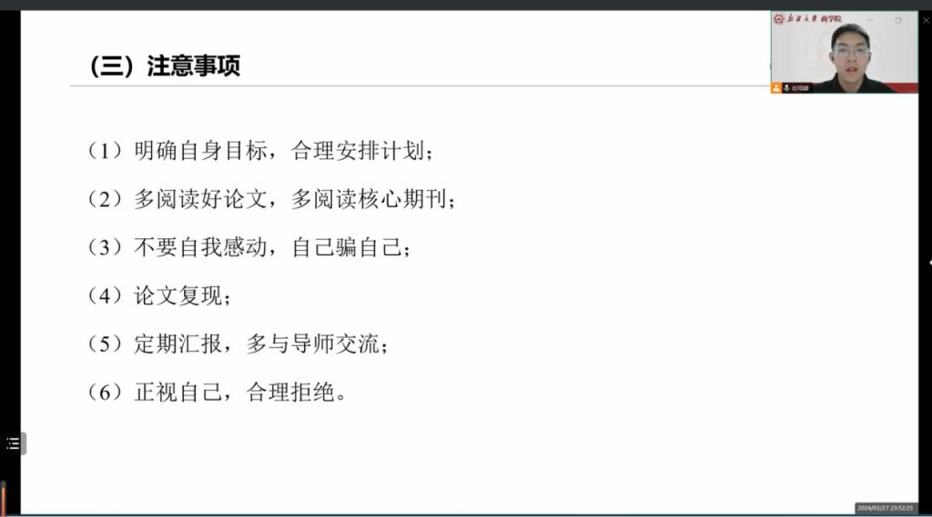 赵旭峰同学从个人留校科研日常、留校科研优劣势分析、现阶段准备工作等方面结合自己的科研经验深入浅出地讲解了留校参与科研的学习与生活经历。首先,他认为留校科研能让同学们在面对复杂问题时更加从容和自信,因为在亲身经历诸多类似情况之后,方知如何去分析和解决。其次,他提出丰富的科研经验能帮助同学们在相关领域积累大量的知识和技巧,使研究更加深入和精准。此外,他强调这种经验能加强同学们的团队成员合作能力,丰富学术生涯。他的分享打开了同学们未来实习与就业的新视角。