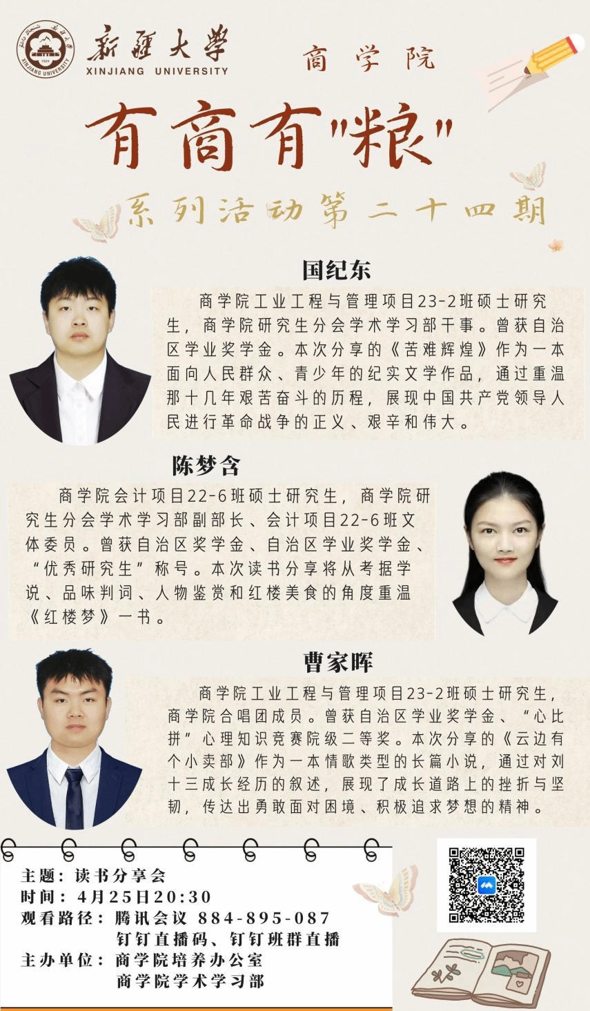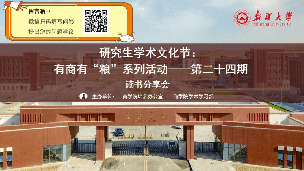 “立身以立学为先,立学以读书为本”。在书的世界里,我们可以跨越时空,对话先贤,洞察古今;可以驰骋想象,翱翔知识天宇,探索未知边界。联合国教科文组织将每年4月23日设立为“世界读书日”,在这个信息爆炸的时代,我们更应静心捧读,让书香浸润生活,让思考伴随阅读。为颂扬阅读力量,激发同学们对书籍与知识的热爱,2024年4月25日晚20:30,体育平台官网培养办公室、研究生分会学术学习部通过线上腾讯会议与钉钉转播的方式,组织开展有商有“粮”系列活动第二十四期——读书分享会。本次活动邀请到体育平台官网经理吕雁琴老师、体育平台官网培养办主任张力老师、体育平台官网培养办常雯青老师和白洁老师出席,由国纪东、陈梦含、曹家晖三位同学主讲,龙康敏同学主持,全院六百余人观看直播会议。