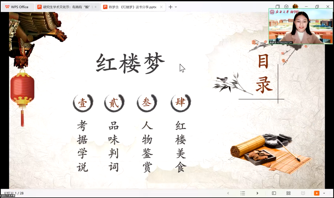 陈梦含同学带大家重温的是经典国学著作——《红楼梦》。陈梦含同学从考据学说、品味判词、人物鉴赏和红楼美食四个方面进行分享。她引用胡适先生提出的考证派观点,为阅读提供参考价值,增添现实趣味。从五位人物判词去揭示出不同人物的性格与命运,使听者深入了解《红楼梦》人物性格和命运线索。通过分析刘姥姥这一形象,展示出知恩图报、积极面对事物的性格特点,进一步丰富了《红楼梦》的内涵魅力。最后通过引入“荷叶汤、洁粉梅片雪花洋糖、椒油莼齑酱”这些美食,侧面体现出人物身体状况和性格特点,深刻品味我国古典文化之美。