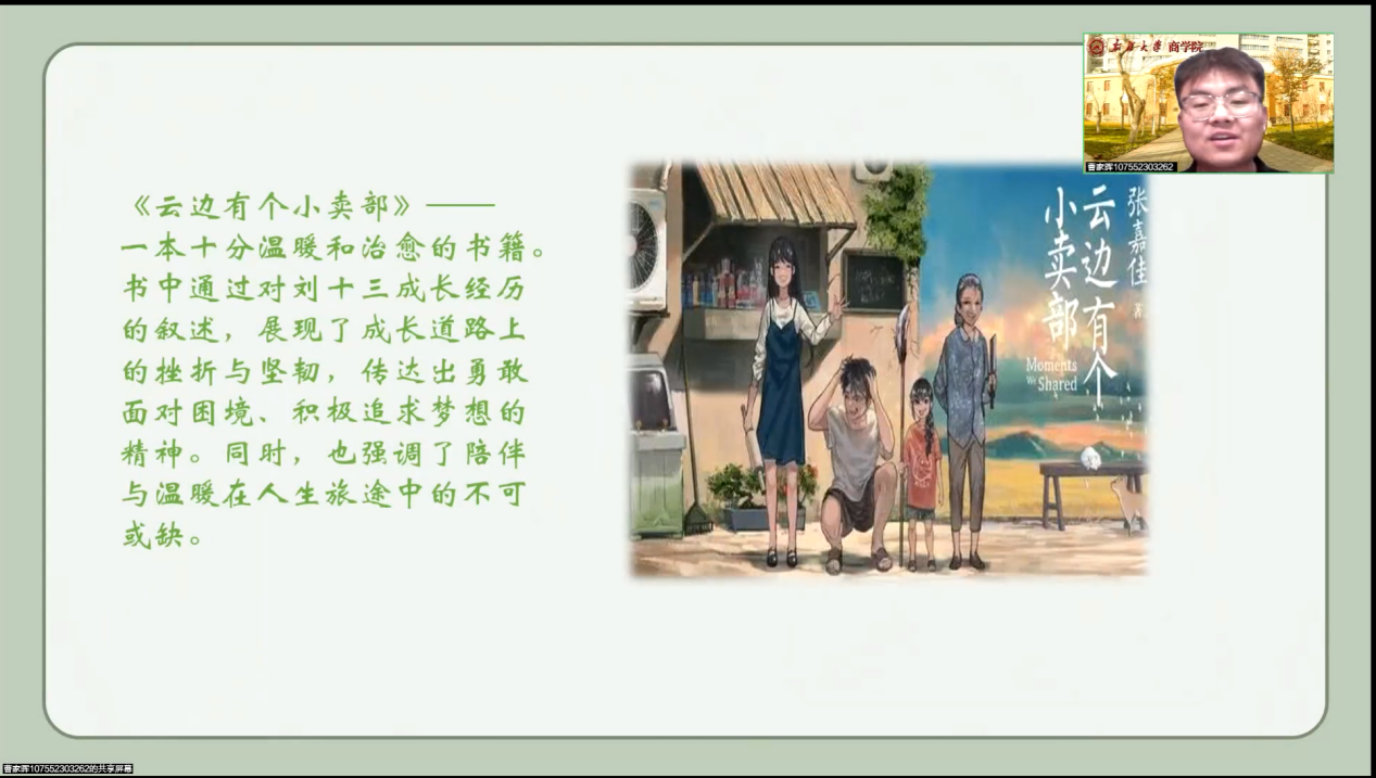 曹家晖同学选择当代作家张嘉佳创作的情歌类长篇小说——《云边有个小卖部》作为分享书目。曹家晖同学从作者简介、故事梗概、人物关系、好句分享和读后感想五个方面展开分享。主人公刘十三的人生转折、自我认识和情感觉醒,外婆王莺莺的坚韧与无私,程霜对于刘十三的生活影响,这些共同描绘出一幅充满乡土气息和人间温情的画卷。小卖部这个象征性存在,不仅记录着少年成长,更蕴含着深沉情感和人生哲理。最后曹家晖同学以“珍惜身边陪伴之人,致人生路上的悲伤、希望与一缕光”作结。