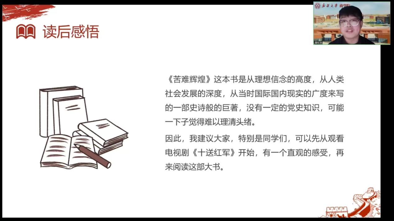 国纪东同学本次分享书目为当代作家金一南创作,面向人民群众、青少年的纪实文学作品——《苦难辉煌》。国纪东同学主要从创作背景、作品介绍、内容简介和读后感悟四个方面进行分享。跟随着国纪东同学的讲述,我们一起重温了中国共产党自成立起15年血与火洗礼的苦难史,革命先辈们怀着崇高革命理想和坚定信念,他们或赫赫有名,或默默无闻,但都甘愿吃苦牺牲以求人民解放。最后,国纪东同学以“一人为己谋生,虽形逸神飞,亦终归微末;一人心系苍生,纵身处平凡,亦堪称伟大”作为自身感悟总结。