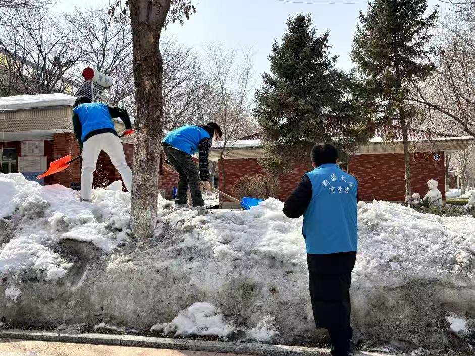 面对园区积雪堆积造成的安全隐患,志愿者们迅速组建清雪突击队,按照“分片包干、协同作战“原则展开攻坚。铲雪组挥动工具清除高处积雪,平整组细致摊平雪堆表面,运输组往返清运残留冰块。经过奋战,有效消除了园区道路安全隐患,为孩子们开辟出安全的活动空间。