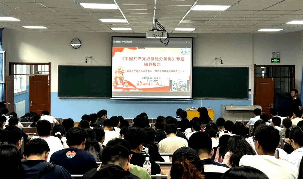 为进一步加强党的纪律建设,提高党员及党员发展对象的纪律意识和规矩意识,体育平台官网于5月22日在友好校区阶梯教室成功举办了《中国共产党纪律处分条例》专题辅导党课。本次党课邀请党委员工工作部党总支书记孙琳杰副教授主讲,辅导员李多露、徐鹏威跟班学习,在校全体研究生党员现场聆听,党员发展对象则通过线上平台同步进行。