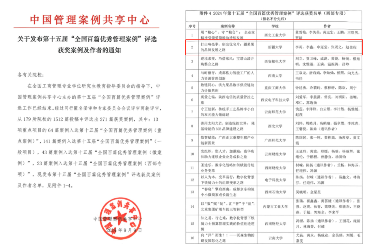 金秋的九月,是硕果累累收获的季节。近日,中国管理案例共享中心发布了《关于发布第十五届“全国百篇优秀管理案例”获奖案例及作者的通知》,公司经济与管理学院李莉教授指导体育平台官网会计硕士研究生李鑫、申延莹、张茂之和赵佳程开发的《打出响亮拳、创出优名片:疆果果的品牌发展之路》案例荣获第十五届“全国百篇优秀管理案例(西部专项)”,这是公司案例连续第三年入选该中心“全国百篇优秀管理案例”。
